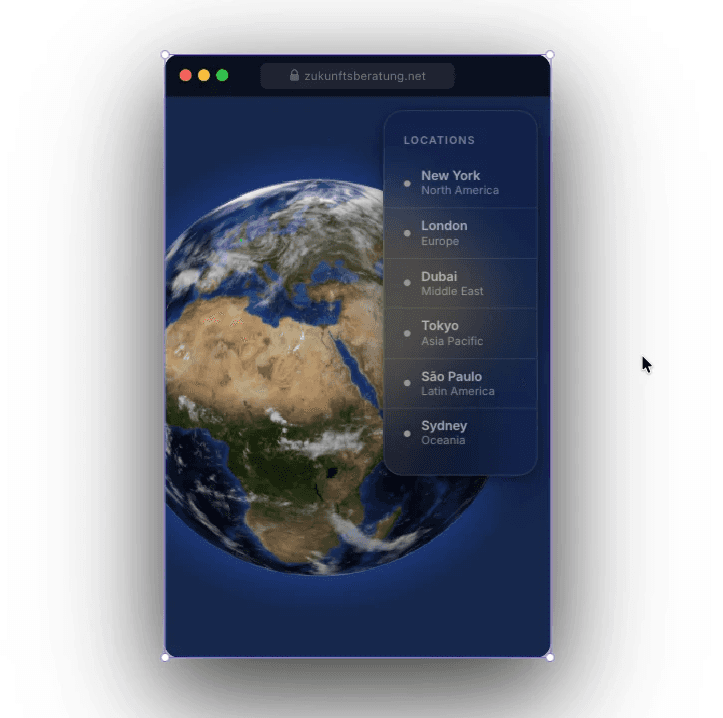 Ein interaktives Globe Dashboard mit rotierendem 3D-Globus, Glassmorphism-Panels und eingebautem Charts.